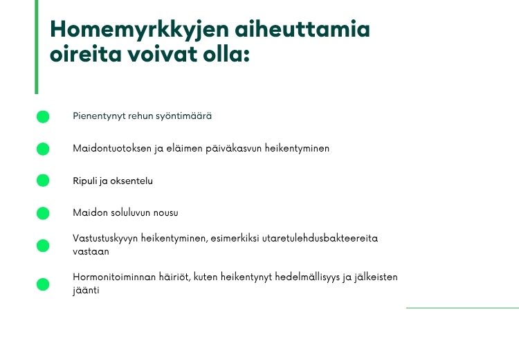 Selvästi homeista rehua ei eläimelle kannata syöttää. Se on huonommin sulavaa, eikä maita niin hyvin kuin puhdas rehu. Mitä pidempään homeista rehua syötetään, sitä suurempi on haittavaikutusten mahdollisuus.