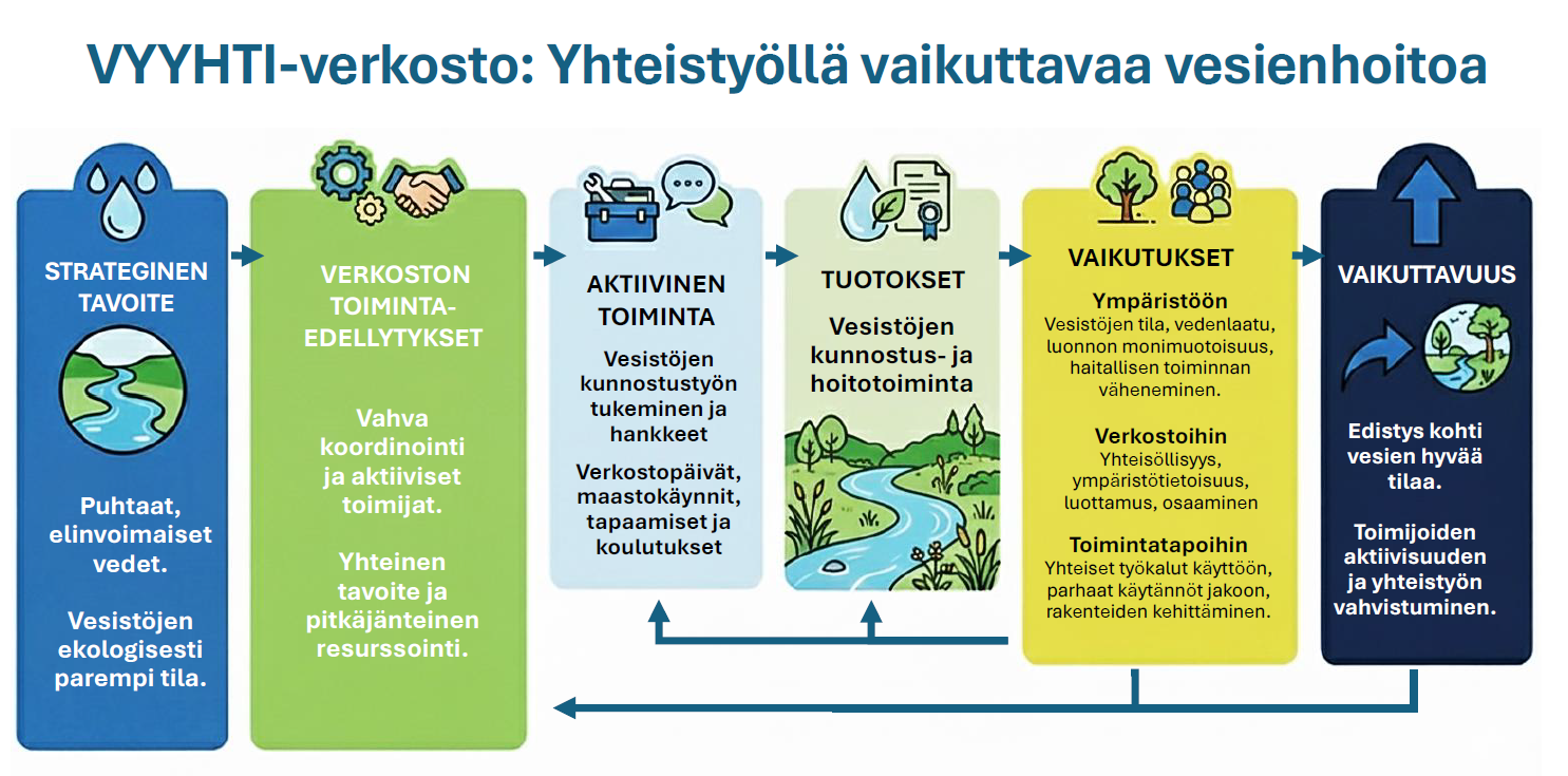 VYYHTI-verkosto on yksi alueellisten vesienhoitoverkostojen edelläkävijöistä. Alan toimijat pitävät sen toimintaa hyvänä, jopa esimerkillisenä. Mutta onko VYYHTI-verkoston toiminta vaikuttavaa ja mitä vaikuttavuus ylipäänsä vesienhoitoverkostossa tarkoittaa? Olisiko verkoston toiminnan vaikuttavuutta mahdollista mitata ja siten kehittää systemaattisesti? Juhlavuoden lähestyessä päätimme ratkoa näitä kysymyksiä yhdessä verkoston toimijoiden kanssa.